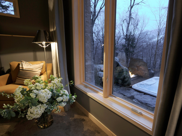"If you look outside at the stone around the fire pit," says interior designer Linda Woodrum, "you'll notice that the colors in that stone foundation are replicated in the bedroom colors."